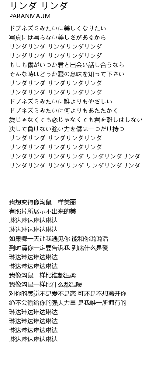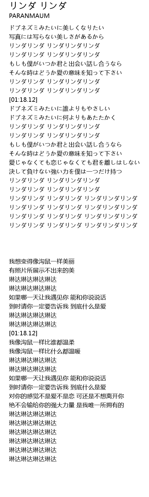 the blue heartsの「リンダ リンダ」動画視聴ページです。歌詞と動画を見ることができます。(歌いだし)ドブネズミみたいに美しく 歌ネットは無料の歌詞検索サービスです。どぶねずみみたいにうつくしくなりたい 想要變得像溝鼠一樣美麗 写真 しゃしん には 写 うつ らない 美 うつく しさがあるから しゃしんにはうつらないうつくしさがあるから 那是照片無法表現出來的美麗 リンダ りんだ リンダ りんだ リンダ りんだThe blue hearts「リンダ リンダ」の歌詞を無料で閲覧できます。